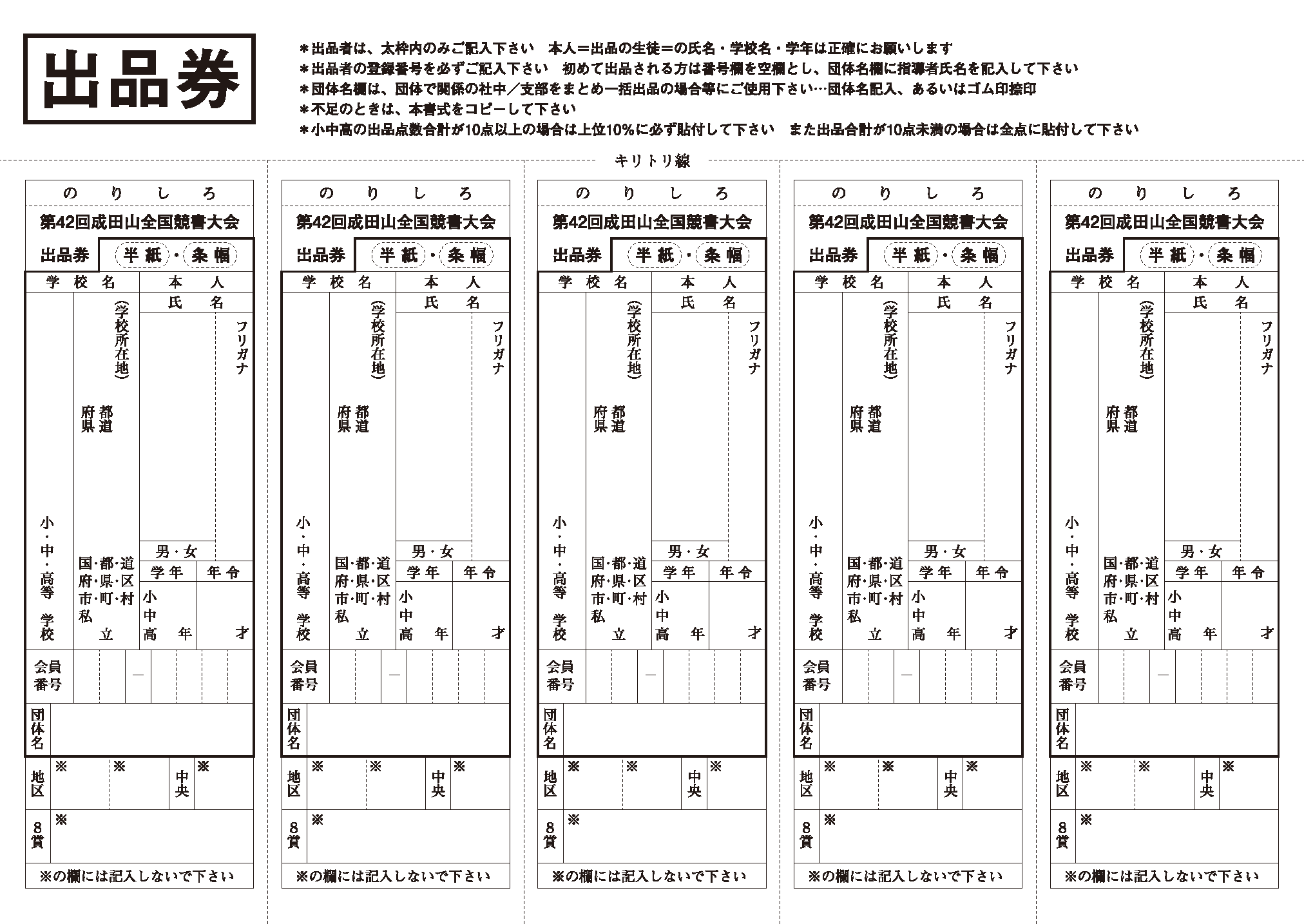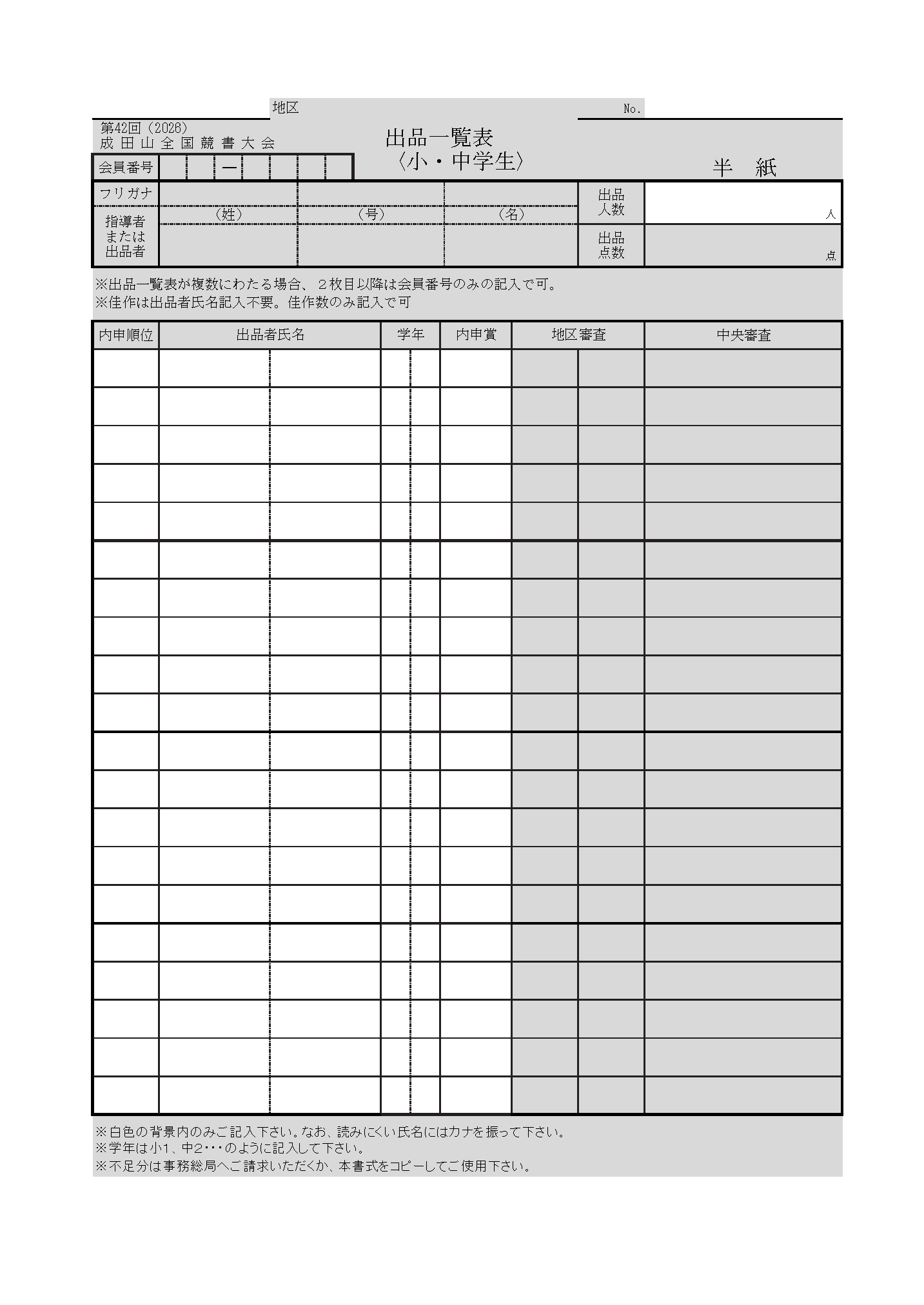 ![]() 表示確認用イメージ | 小・中学生の部 半紙 ▼ 出品一覧表(小・中学生の部)半紙.pdf(148KB) 小・中学生の部 条幅 ▼ 出品一覧表(小・中学生の部)条幅.pdf(87KB) 高校生の部 半紙 ▼ 出品一覧表(高校生の部)半紙.pdf(87KB) 高校生の部 条幅 ▼ 出品一覧表(高校生の部)条幅.pdf(87KB) |