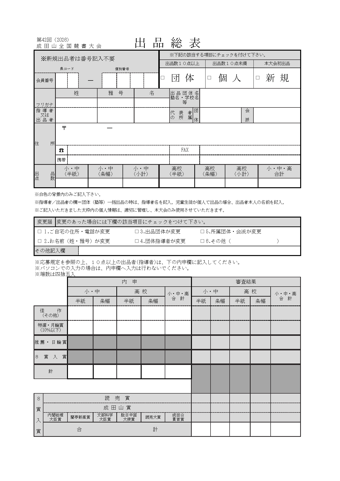 ![]() 表示確認用イメージ | 出品総表 ▼ 出品総表.pdf(375KB) PC入力用Excelファイルはこちら ▼ 出品総表.xlsx(63KB) ※別シートにて「出品一覧表」も入力する事ができます。 |